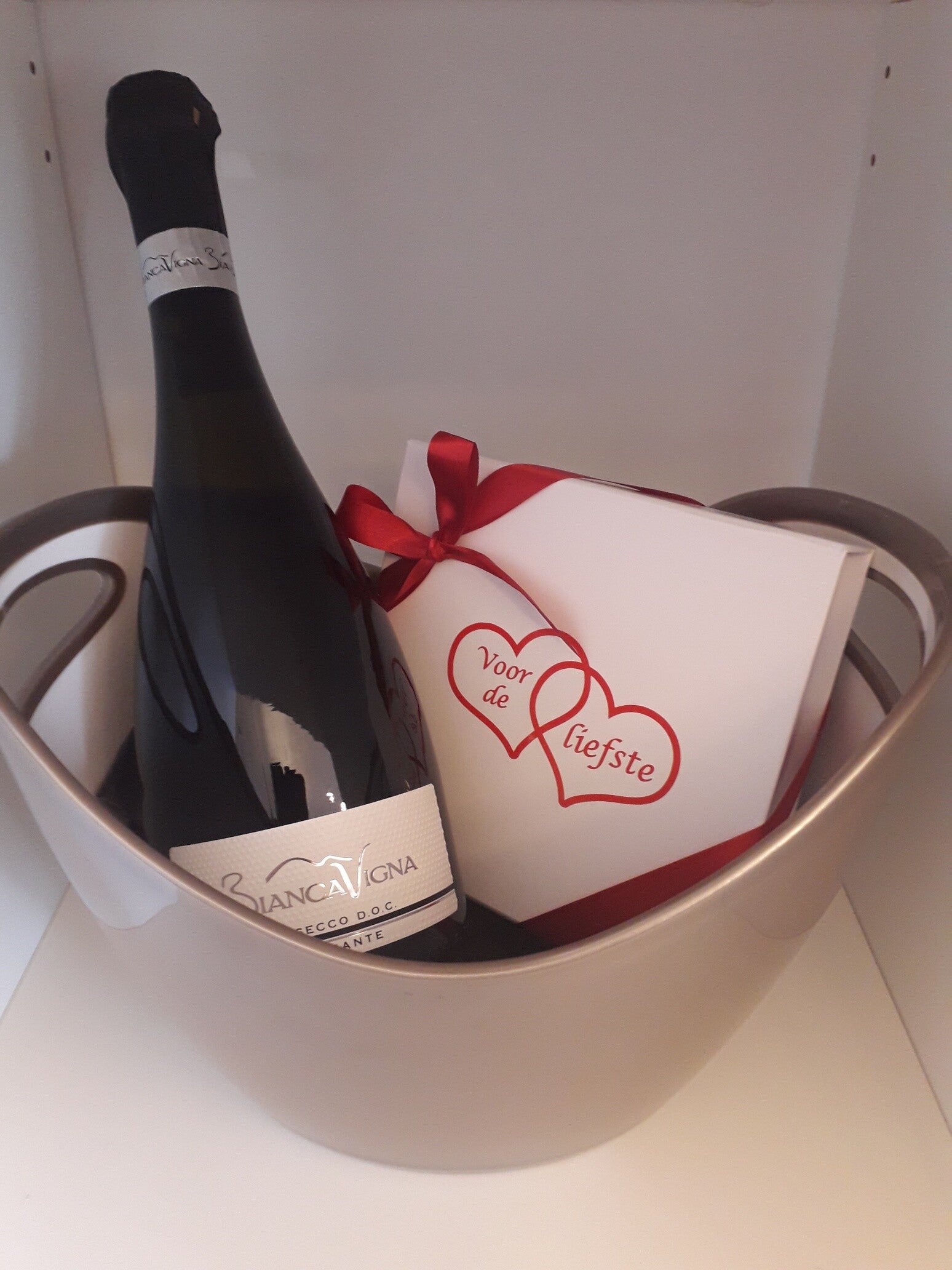 gevuld met een fles Italiaanse Prosecco en een doosje pralines
