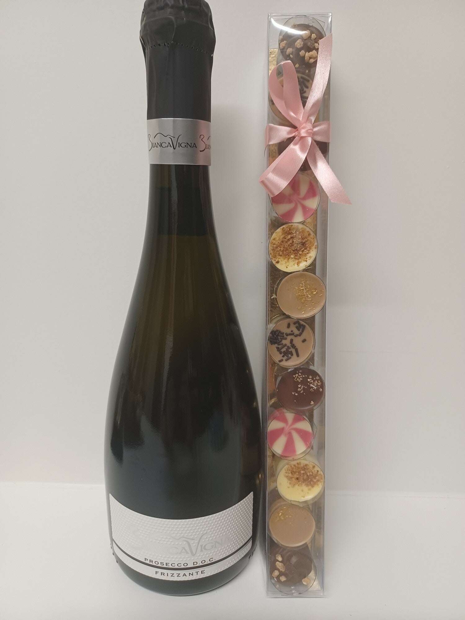 Fles Prosecco Frizzante en een doosje met 12 dessertpralines